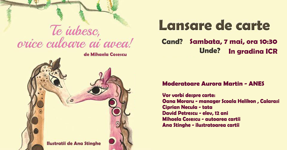 Te Iubesc Orice Culoare Ai Avea Crestem Oameni Source from : https://crestemoameni.ro/shop/carti/te-iubesc-orice-culoare-ai-avea/ Și vreo mie de copii țin cartea în brațe, o citesc împreună cu părinți, bunici, prieteni, profesori, educatori, joacă jocul din carte, plâng, râd, fac crize de gelozie sau de furie după care cer cartea de 10 ori pe seară. Știu amândoi cele câteva versuri din carte pe dinafară, știu paragrafe pe de rost. Am citit cu nesaț și privit desenele din cartea mihaelei. Te iubesc, orice culoare ai avea. În fine, toate lucrurile care transformă dragostea în sclavie.