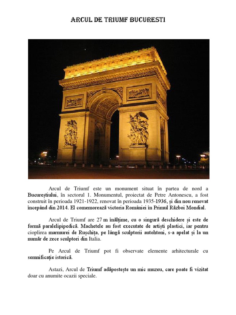 Nu vreau sa ma gandesc la ce ar putea sa insemne asta. Iubitoare de munte ce caut? Standing 25m high, the arc has a staircase that allows visitors to climb to the terrace on. The original arc was made of wood, replaced by the present, petru antonescu designed concrete structure only in 1935. Arcul de triumf isi deschide portile pentru cititori la noaptea cartilor deschise.