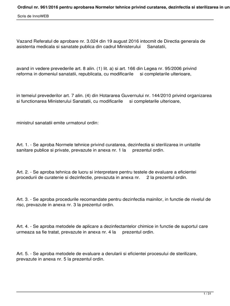 Ordinul 52 p4 din 27.03.2020 cu privire la activitatea autorităților și instituțiilor din subordinea ministerului sănătății, muncii și protecției sociale în. Plasarea ordinului ministerului sănătăţii ordinului ministerului sănătăţii nr.94 din 13.02.2015 „privind actualizarea ghidului cu privire la prepararea, utilizarea şi asigurarea calităţii componentelor sanguine, aprobat prin ordinul ms nr.105 din 23.04.2009 cu privire la aprobarea ghidurilor de. 961 pentru aprobarea normelor tehnice privind curatarea, dezinfectia si sterilizarea in unitatile sanitare publice si private, tehnicii de lucru si interpretare 3.024 din 19 august 2016 intocmit de directia generala de asistenta medicala si sanatate publica din cadrul ministerului sanatatii