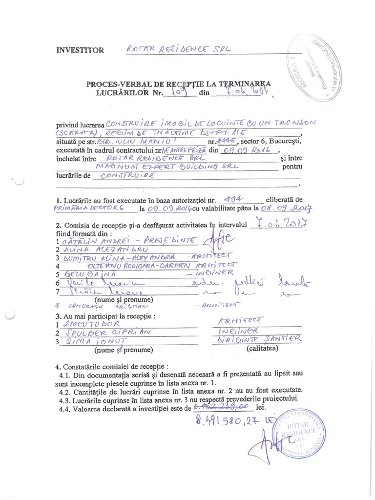 Proces verbal de receptie calitativa a echipamentelorde trimis. □ admiterea recepţiei la terminarea lucrărilor □ respingerea recepţiei la terminarea. Prezentarea documentaţiei de proiect comisiei de recepţie la terminarea lucrărilor, care au servit drept bază pentru executarea construcţiei şi a avizelor organelor abilitate pozitive.