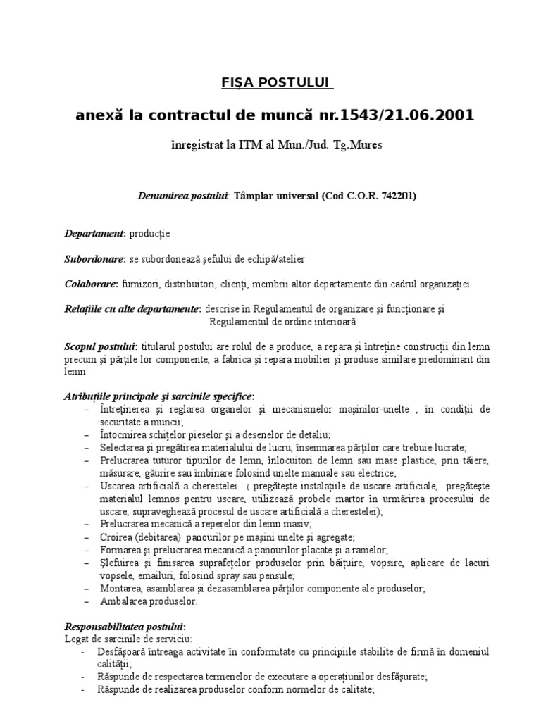 Îmbina, preseaza, încleiaza, ajusteaza si finiseaza; Descrise in regulamentul de ordine interioarascopul postului: Aceste documente obligatorii pentru ocupantul postului de tâmplar universal (cod cor 752201), sunt complet întocmite, respectând cerințele codului muncii actualizat 2020, legii securității și sănătății în muncă nr.