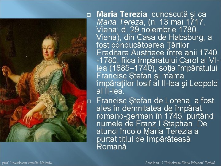 Mária terézia, ktorá žila v rokoch 1717 až 1780, vládla v krajine pevnou rukou. Mária terézia a felvilágosult abszolutizmus kiemelkedő alakja volt. Împărăteasa a apărat austria în timpul invaziei prusace şi a iniţiat mai multe proiecte care aveau ca scop îmbunătăţirea traiului cotian al poporului său.